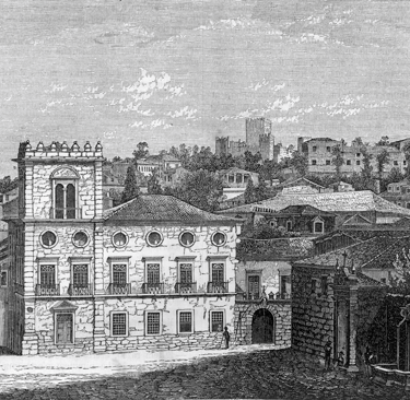 Ao sair da igreja dão os olhos de frente no formoso painel que a nossa gravura representa. E um lindo e pitoresco apinhoado de edificações de diferente género, e de variados tipos de arquitectura, coroadas, ou divididas e orladas de arvoredo.